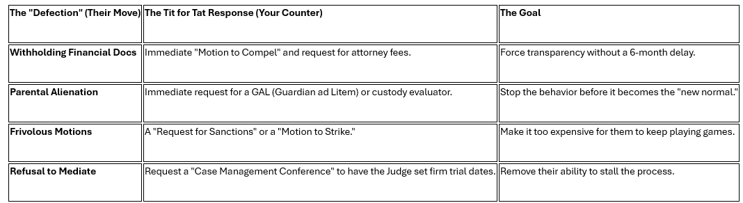 The Tit for Tat strategy is effective because it removes the "emotional" element of the divorce or other family law litigation and replaces it with a logical "if/then" system. It protects you from being a doormat while preventing you from looking like the villain in the eyes of the court.